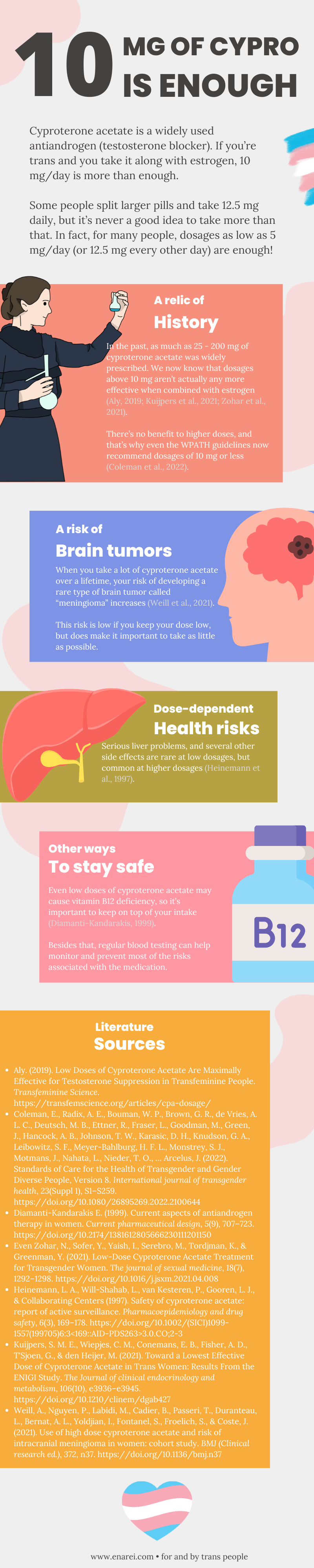 Cyproterone acetate is a widely used antiandrogen (testosterone blocker). If you’re trans and you take it along with estrogen, 10 mg/day is more than enough.
