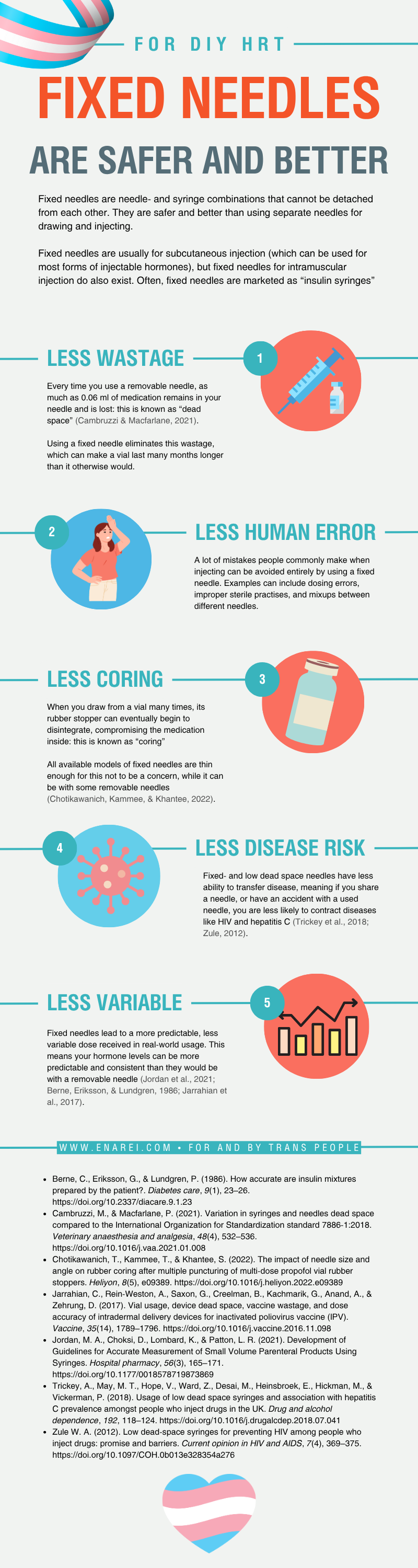 We maintain a collection of eye-catching infographics with information on trans health and ways to stay safe. They're meant to be easily shared, accessible, and draw attention to DIY HRT subjects that are rarely covered elsewhere.
